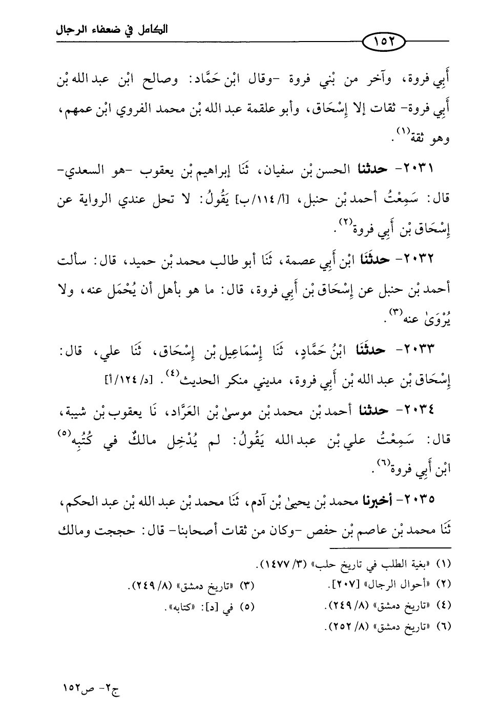 2034 - حَدثنا أحمد بن مُحمد بن موسى بن العراد، حَدثنا يعقوب بن شيبة، قال: سمعتُ علي بن عَبد الله يقول: لم يدخل مالك في كتبه ابن أبي فروة.