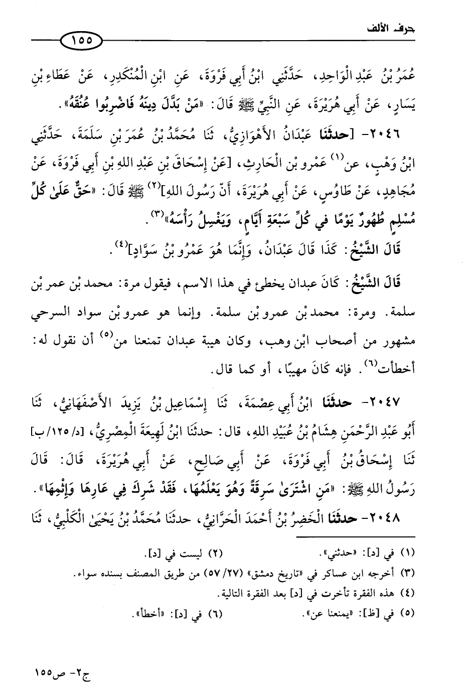 2046 - حَدثنا عبدان الأهوازي، حَدثنا مُحمد بن عُمر بن سلمة، حَدَّثني ابن وهب، عن عَمرو بن الحارث، عن إسحاق بن عَبد الله بن أبي فروة، عن مجاهد، عن طاوس، عن أبي هريرة، أن رسول الله صَلى الله عَليه وسَلم قال: حق على كل مسلم طهور يومًا في كل سبعة أيام، ويغسل رأسه.
