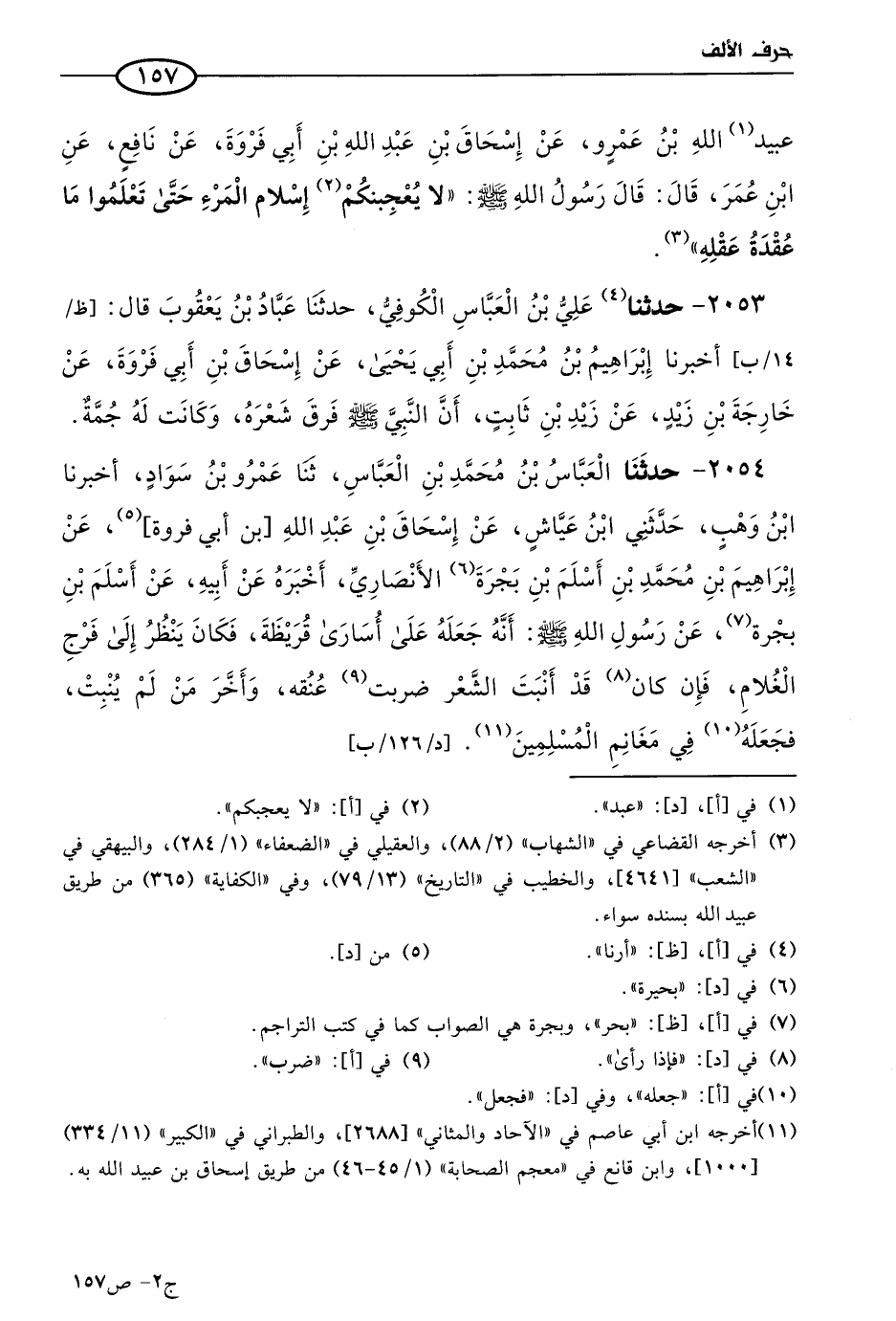 2053 - حدثنا علي بن العباس الكوفي، حَدثنا عباد بن يعقوب، قال: أخبرنا إبراهيم بن مُحمد بن أبي يَحيى، عن إسحاق بن أبي فروة، عن خارجة بن زيد، عن زيد بن ثابت، أَن النَّبي صَلى الله عَليه وسَلم فرق شعره، وكانت له جُمة.