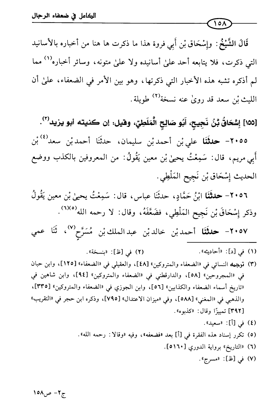 2055 - حَدثنا علي بن أحمد بن سليمان، حَدثنا أحمد بن سعد بن أبي مريم، قال: سمعتُ يَحيى بن مَعين يقول: مَن المعروفين بالكذب، ووضع الحديث إسحاق بن نجيح المَلَطي.