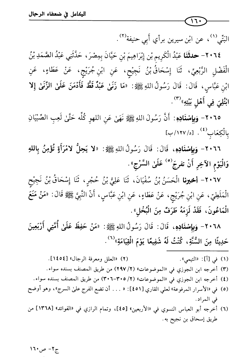2064 - حَدثنا عَبد الكريم بن إبراهيم بن حِبَّان (1) بمصر، حَدَّثني عَبد الصمد بن الفضل الربعي، حَدثنا إسحاق بن نجيح، عن ابن جُرَيج، عن عطاء، عن ابن عباس، قال: قال رسول الله صَلى الله عَليه وسَلم: ما زنى عَبد قط فأدمن على الزنا، إلا ابتلي في أهل بيته.