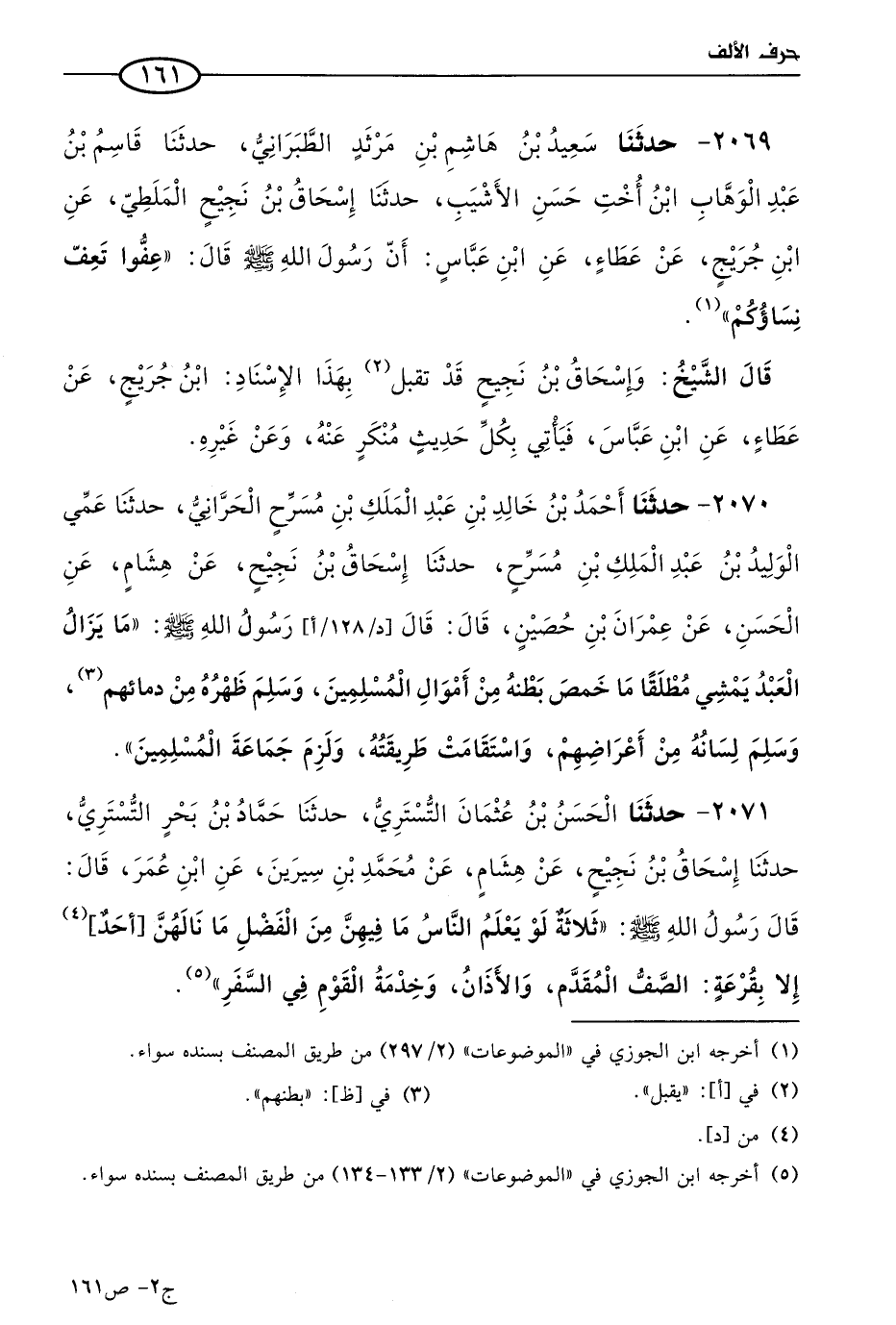 2069 - حَدثنا سعيد بن هاشم بن مرثد الطبراني، حَدثنا قاسم بن عَبد الوهاب، ابن أخت حسن الأشيب، حَدثنا إسحاق بن نجيح الملطي، عن ابن جُرَيج، عن عطاء، عن ابن عباس، أَن رسُول الله صَلى الله عَليه وسَلم قال: عفوا تعف نساؤكم.