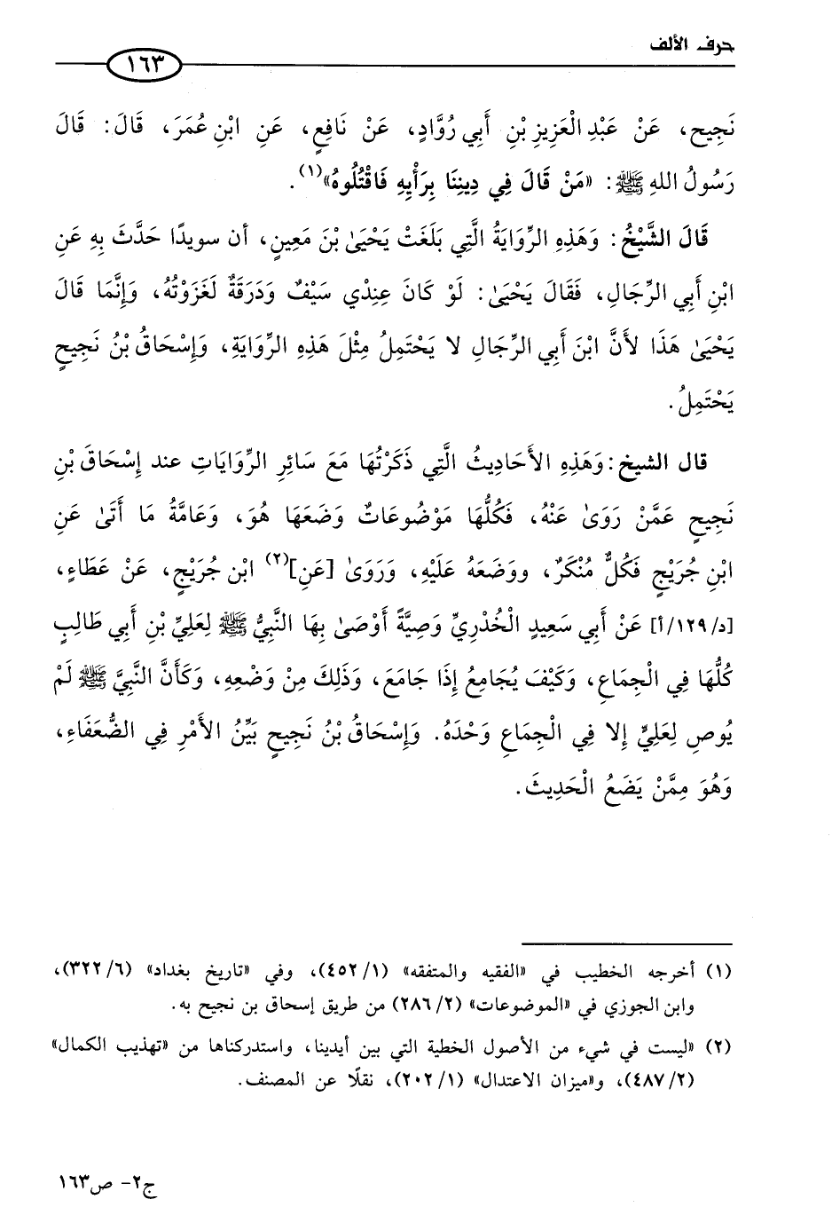 قال الشيخ: وهذه الأحاديث التي ذكرتها مع سائر الروايات عند إسحاق بن نجيح عَمَّن روى عنه، فكلها موضوعات، وضعها هو، وعامة ما أتى عن ابن جُرَيج، فكلٌ منكر، ووضعه عليه، وروى عن ابن جُرَيج، عن عطاء، عن أبي سعيد الخدري؛ وصية أوصى بها النبي صَلى الله عَليه وسَلم لعلي بن أبي طالب، كلها في الجماع، وكيف يجامع إذا جامع، وذلك من وضعه، وكأن النبي صَلى الله عَليه وسَلم لم يوص لعلي إلا في الجماع وحده.