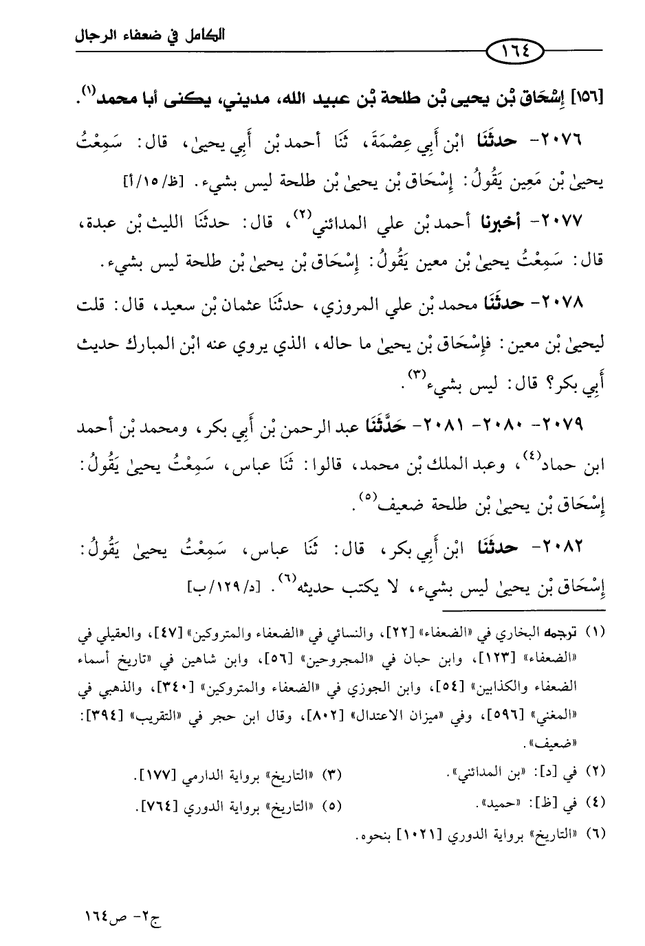 2079 - 2080 - 2081 - حَدثنا عَبد الرحمن بن أبي بكر، ومُحمد بن أحمد بن حماد، وعَبد الملك بن مُحمد، قالوا: حَدثنا عباس سمعت يَحيى يقول: إسحاق بن يَحيى بن طلحة ضعيف.