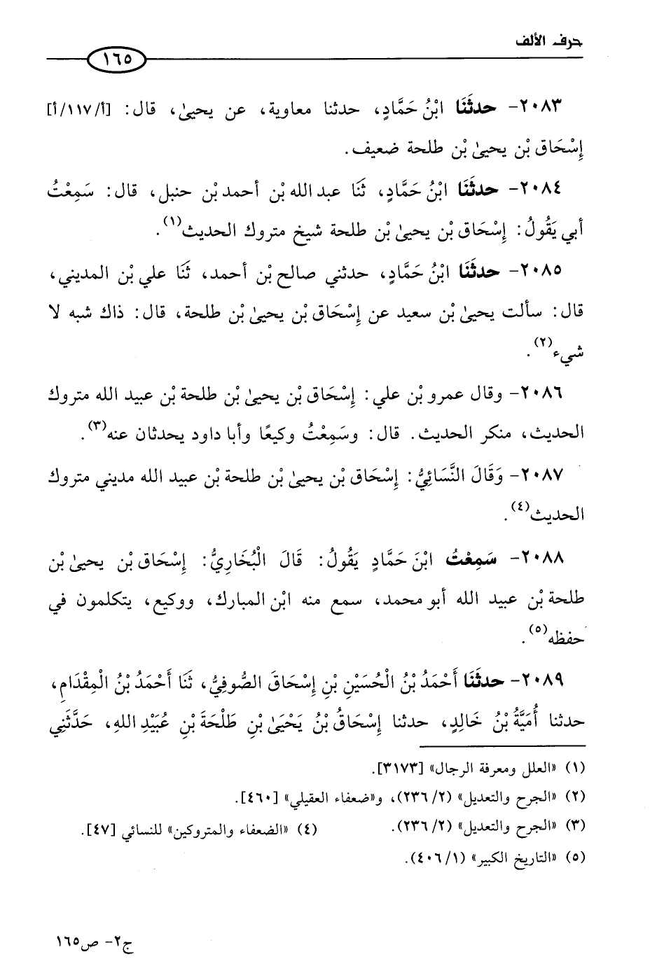 2083 - حَدثنا ابن حماد، حَدثنا معاوية، عن يَحيى قال: إسحاق بن يَحيى بن طلحة ضعيف.
