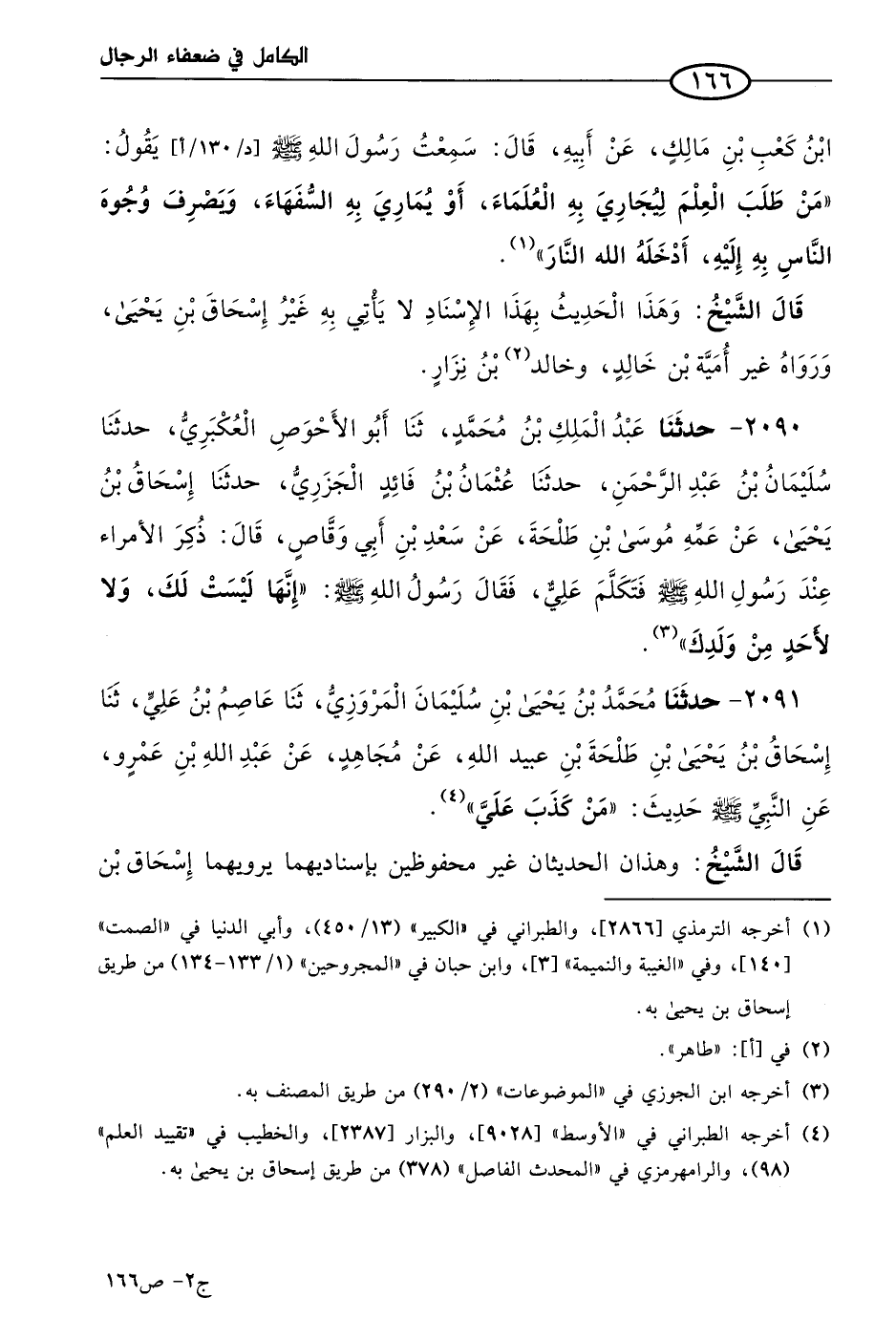 2091 - حَدثنا مُحمد بن يَحيى بن سليمان المروزي، حَدثنا عاصم بن علي، حَدثنا إسحاق بن يَحيى بن طلحة بن عُبيد الله، عن مجاهد، عن عَبد الله بن عَمرو، عن النبي صَلى الله عَليه وسَلم؛ حديث من كذب علي.
