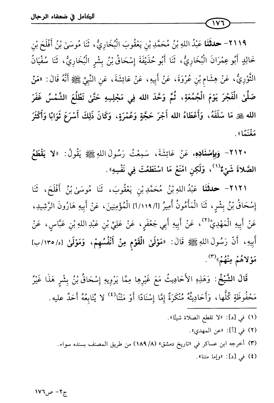 2121 - حَدثنا عَبد الله بن مُحمد بن يعقوب، حَدثنا موسى بن أفلح، حَدثنا إسحاق بن بشر، حَدثنا المأمون أمير المؤمنين، عن أبيه هارون الرشيد، عن أبيه المهدي، عن أبيه أبي جعفر، عن علي بن عَبد الله بن عباس، عن أبيه، أَن رسُول الله صَلى الله عَليه وسَلم قال: مولى القوم من أنفسهم، ومولى مولاهم منهم.