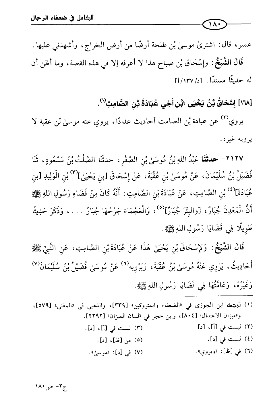 قال الشيخ: ولإسحاق بن يَحيى هذا عن عبادة بن الصامت، عن النبي صَلى الله عَليه وسَلم أحاديث، يروي عنه موسى بن عقبة، ويرويه عن موسى فضيل بن سليمان وغيره، وعامتها في قضايا رسول الله صَلى الله عَليه وسَلم.