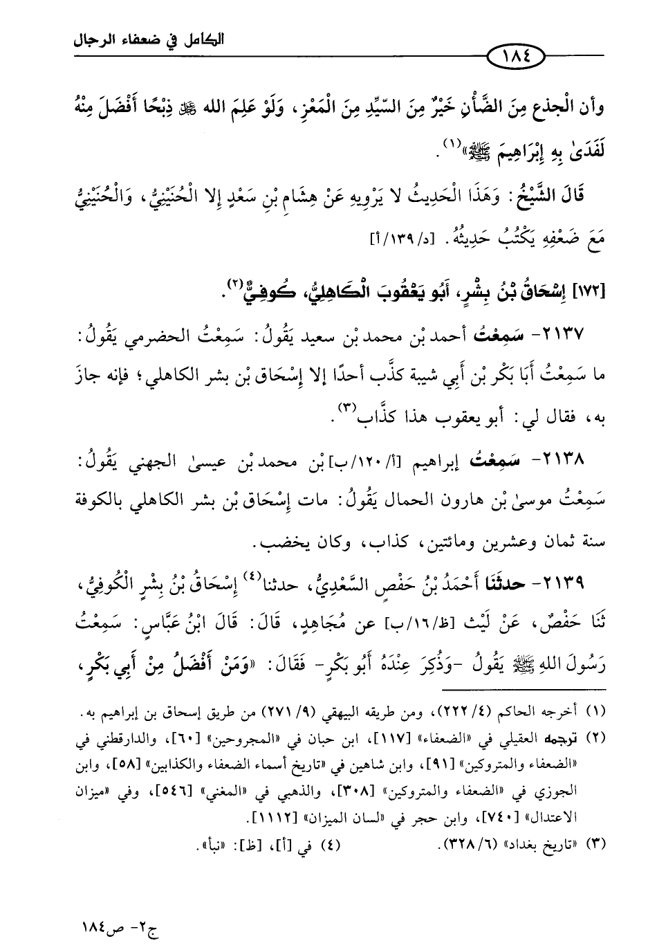 2137 - سمعت أحمد بن مُحمد بن سعيد يقول: سَمعتُ الحضرمي يقول: ما سمعت أبا بكر بن أبي شيبة كذَّب أحدًا إلا إسحاق بن بشر الكاهلي، فإنه جاز به، فقال لي: أَبو يعقوب هذا كذاب.