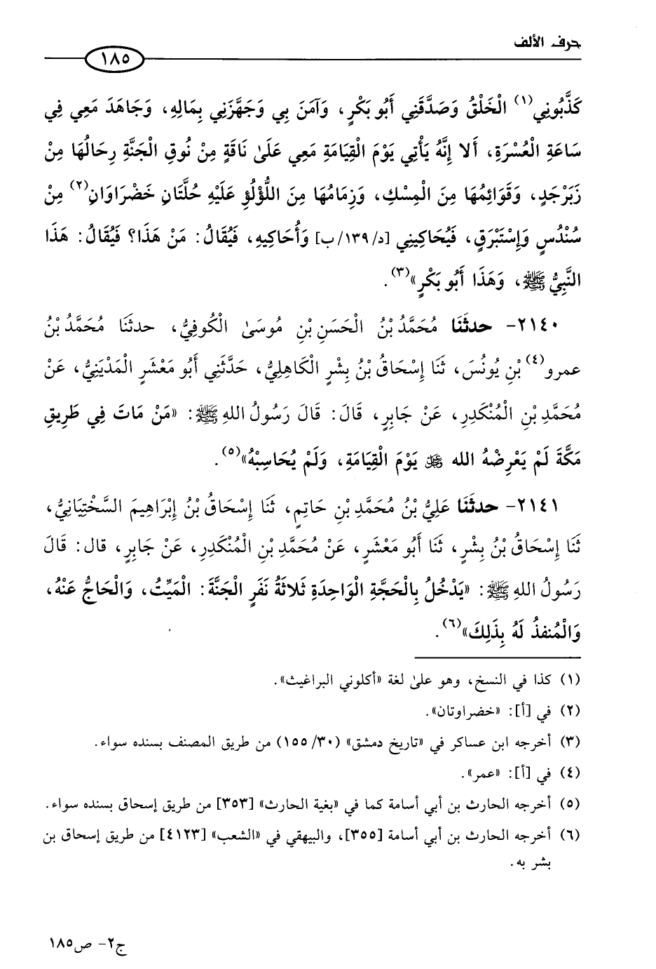 2140 - حَدثنا مُحمد بن الحسن بن موسى الكوفي، حَدثنا مُحمد بن عمرو بن يُونُس، حَدثنا إسحاق بن بشر الكاهلي، حَدَّثني أَبو معشر المديني، عن مُحمد بن المنكدر، عن جابر، قال: قال رسول الله صَلى الله عَليه وسَلم: من مات في طريق مكة لم يعرضه الله عَزّ وجَلّ يوم القيامة، ولم يحاسبه.