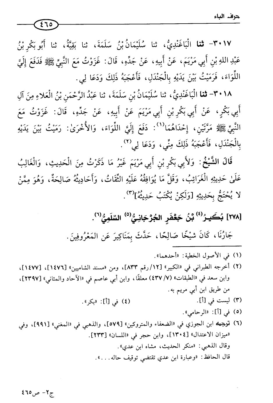 3018 - حَدثنا الباغندي، حَدثنا سليمان بن سلمة، حَدثنا عَبد الرحمن بن العلاء، من آل أبي بكر، عن أبي بكر بن أبي مريم، عن أبيه، عن جَدِّهِ، قال: غزوت مع النبي صَلى الله عَليه وسَلم مرتين، إحداهما دفع إليَّ اللواء، والأخرى رميت بين يديه بالجندل فأعجبه ذلك مني ودعا لي.