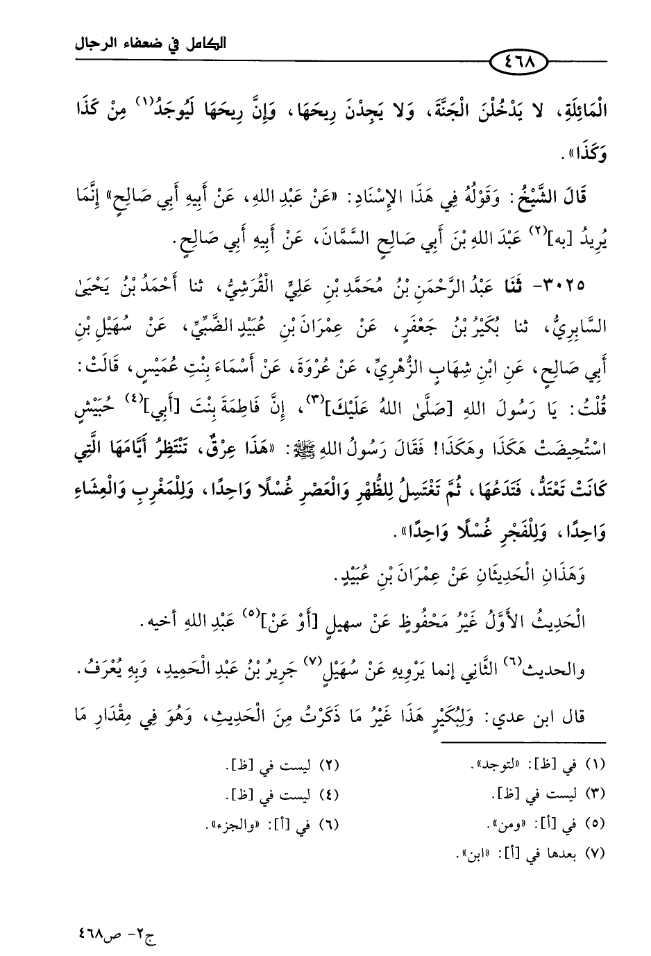 3025 - حَدثنا عَبد الرحمن بن مُحمد بن علي القرشي، حَدثنا أحمد بن يَحيى السابري، حَدثنا بُكَير بن جعفر عن عمران بن عُبيد الضبي، عن سهيل بن أبي صالح، عن ابن شهاب الزُّهْري، عن عروة عن أسماء بنت عميس قالت: قلت: يا رسول الله، صلى الله عليك إن فاطمة بنت أبي حبيش استحيضت هكذا هكذا، فقال رسول الله صَلى الله عَليه وسَلم: هذا عرق، تنتظر أيامها التي كانت تعتد فتدعها ثم تغتسل للظهر والعصر غسلا واحدا وللمغرب والعشاء واحدا، وللفجر غسلا واحدا.