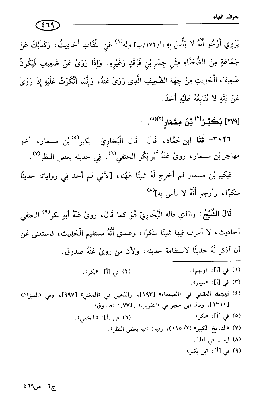 فبكير بن مسمار لم أخرج له شيئا هاهنا، لأني لم أجد في رواياته حديثًا منكرا وأرجو أنه لا بأس به.