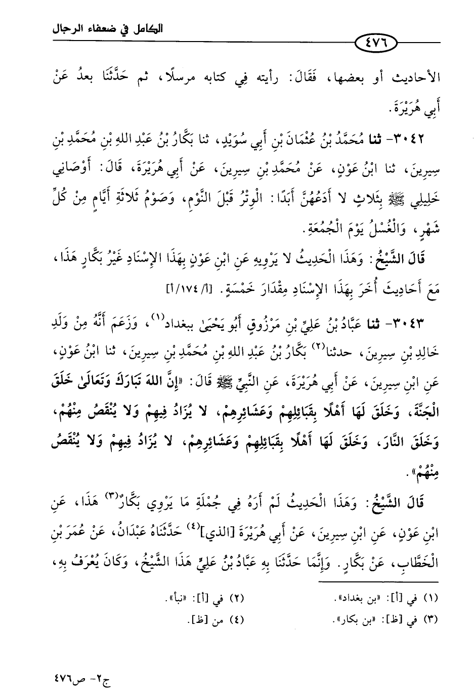 3043 - حَدثنا عباد بن علي بن مرزوق أَبو يَحيى ببغداد، وزعم أنه من ولد خالد بن سِيرين، حَدثنا بكار بن عَبد الله بن مُحمد بن سِيرين، حَدثنا ابن عون، عن ابن سِيرين، عن أبي هريرة، عن النبي صَلى الله عَليه وسَلم، قال: إن الله تبارك وتعالى خلق الجنة وخلق لها أهلا بقبائلهم وعشائرهم لا يزاد فيهم، ولا ينقص منهم، وخلق النار وخلق لها أهلا بقبائلهم وعشائرهم، لا يزاد فيهم، ولا ينقص منهم.