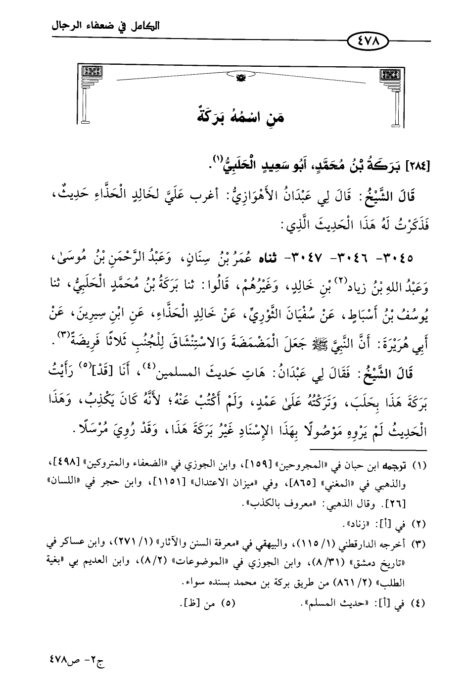 قال الشيخ: فقال لي عبدان: هات حديث المسلمين أنا قد رأيت بركة هذا بحلب وتركته على عمد ولم أكتب عنه لأنه كان يكذب، وهذا الحديث لم يروه موصولا بهذا الإسناد غير بركة هذا، وقد روي مرسلا.