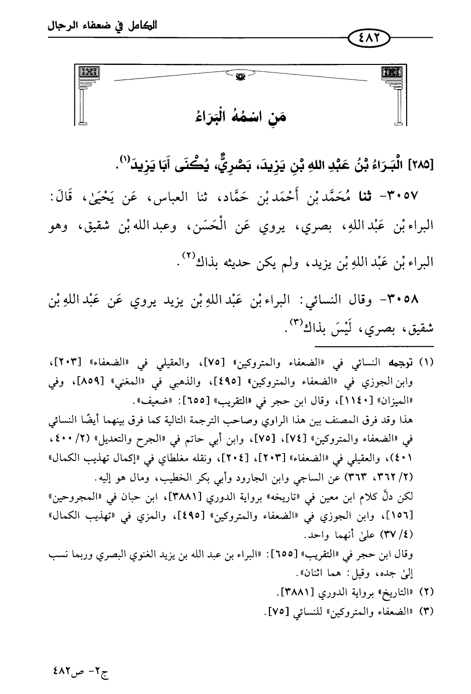 3058 - وقال النسائي: البراء بن عَبد الله بن يزيد يروي عن عَبد الله بن شقيق، بصري ليس بذاك.