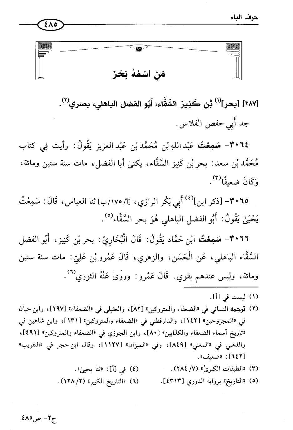 3065 - ذكر بن أبي بكر الرازي، حَدثنا العباس، قال: سمعتُ يَحيى يقول: أَبو الفضل الباهلي هو بحر السقاء.