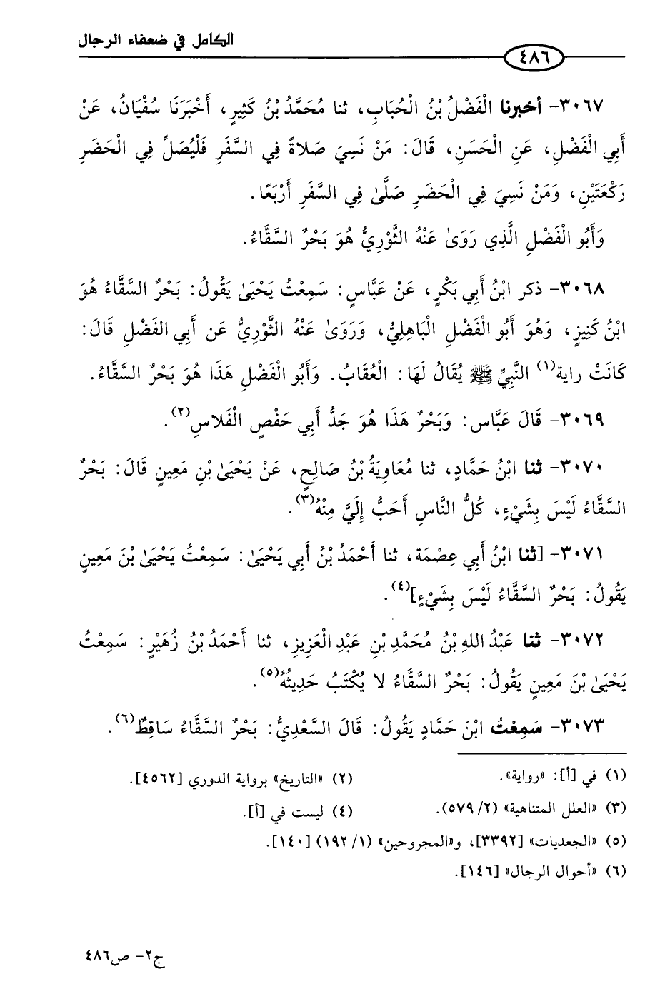 3070 - حَدثنا ابن حماد، حَدثنا معاوية بن صالح، عن يَحيى بن مَعين قال: بحر السقاء ليس بشَيءٍ، كل الناس أحب إليَّ منه.