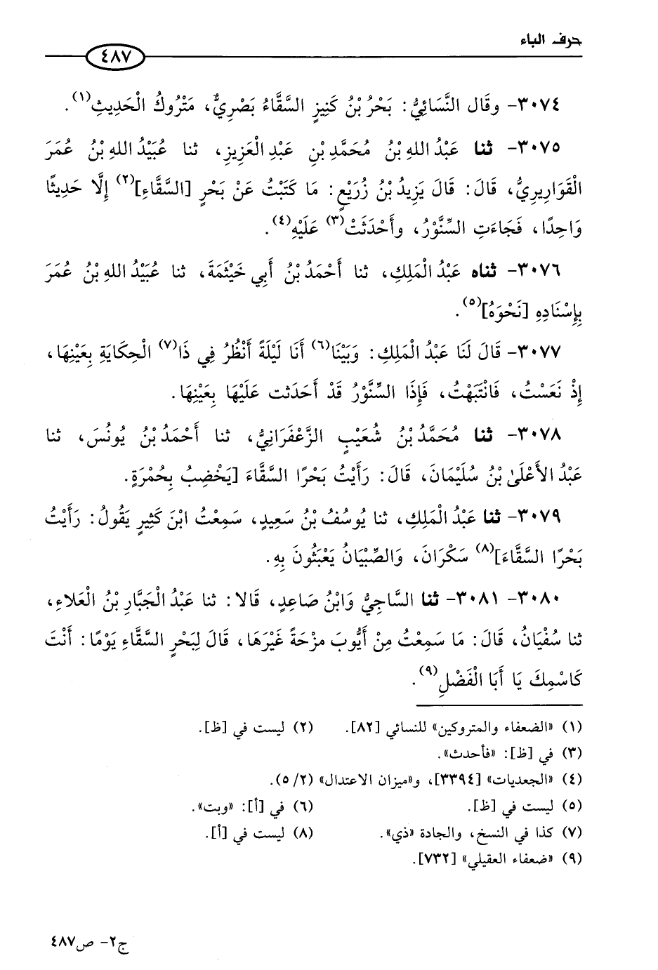 3080 - 3081 - حَدثنا الساجي، وابن صاعد، قالا: حَدثنا عَبد الجبار بن العلاء، حَدثنا سفيان قال: مَا سمعت من أيوب مزحة غيرها، قال لبحر السقاء يومًا: أنت كاسمك يا أبا الفضل.