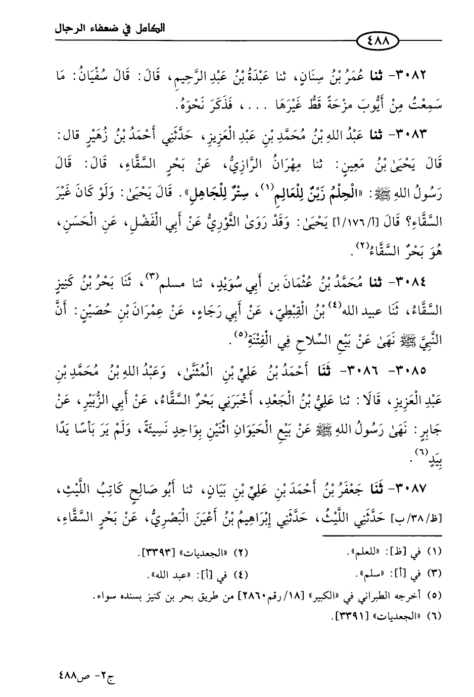 3083 - حَدثنا عَبد الله بن مُحمد بن عَبد العزيز، حَدَّثني أحمد بن زهير، قال: قال يَحيى بن مَعين: حَدثنا مهران الرازي، عن بحر السقاء، قال: قال رسول الله صَلى الله عَليه وسَلم: الحلم زين للعالم، ستر للجاهل.