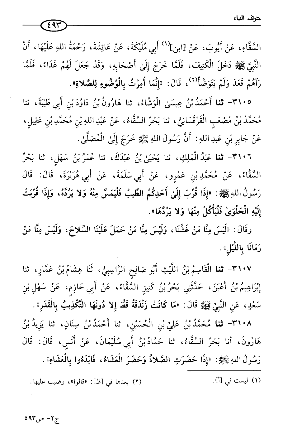 3108 - حَدثنا مُحمد بن علي بن الحسين، حَدثنا أحمد بن سنان، حَدثنا يزيد بن هارون، أنا بحر السقاء، حَدثنا حماد بن أبي سليمان، عن أَنَس، قال: قال رسول الله صَلى الله عَليه وسَلم: إذا حضرت الصلاة وحضر العشاء فابدأوا بالعشاء.