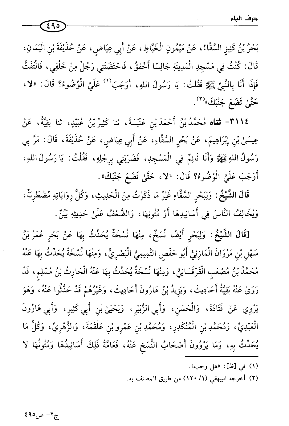 3114 - حَدثناهُ أحمد بن مُحمد بن عنبسة (1)، حَدثنا كثير بن عُبيد، حَدثنا بَقِية، عن عيسى بن إبراهيم، عن بحر السقاء، عن أبي عياض، عن حذيفة قال: مر بي رسول الله صَلى الله عَليه وسَلم وأنا نائم في المسجد، فضربني برجله، فقلت: يا رسول الله، أوجب علي الوضوء؟ قال: لاَ، حتى تضع جنبك.