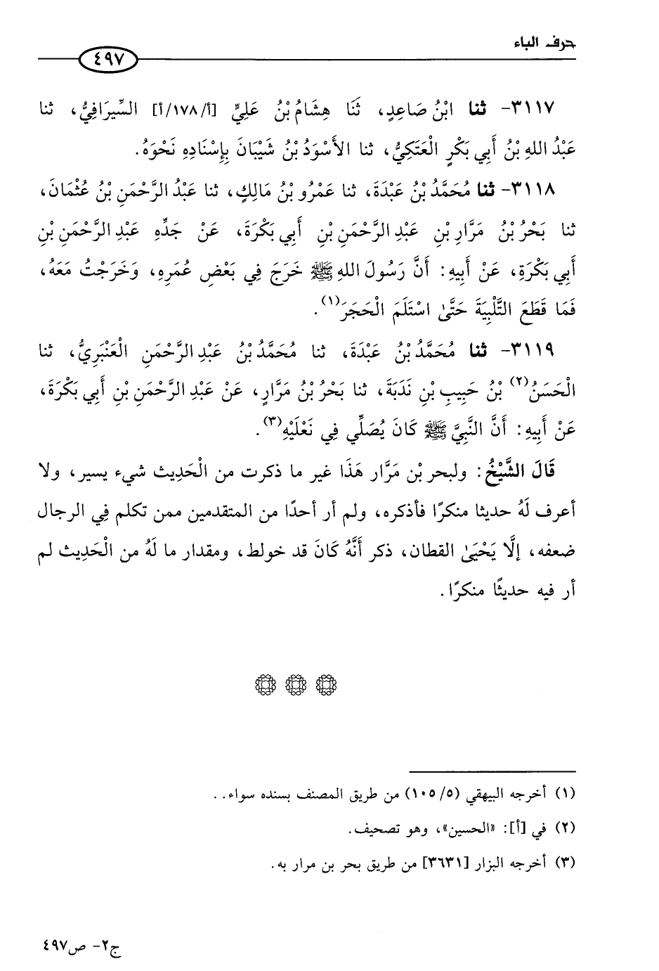 3119 - حَدثنا مُحمد بن عبدة، حَدثنا مُحمد بن عَبد الرحمن العنبري، حَدثنا الحسن بن حبيب بن ندبة، حَدثنا بحر بن مرار، عن عَبد الرحمن بن أبي بكرة، عن أبيه؛ أن النبي صَلى الله عَليه وسَلم كان يصلي في نعليه.