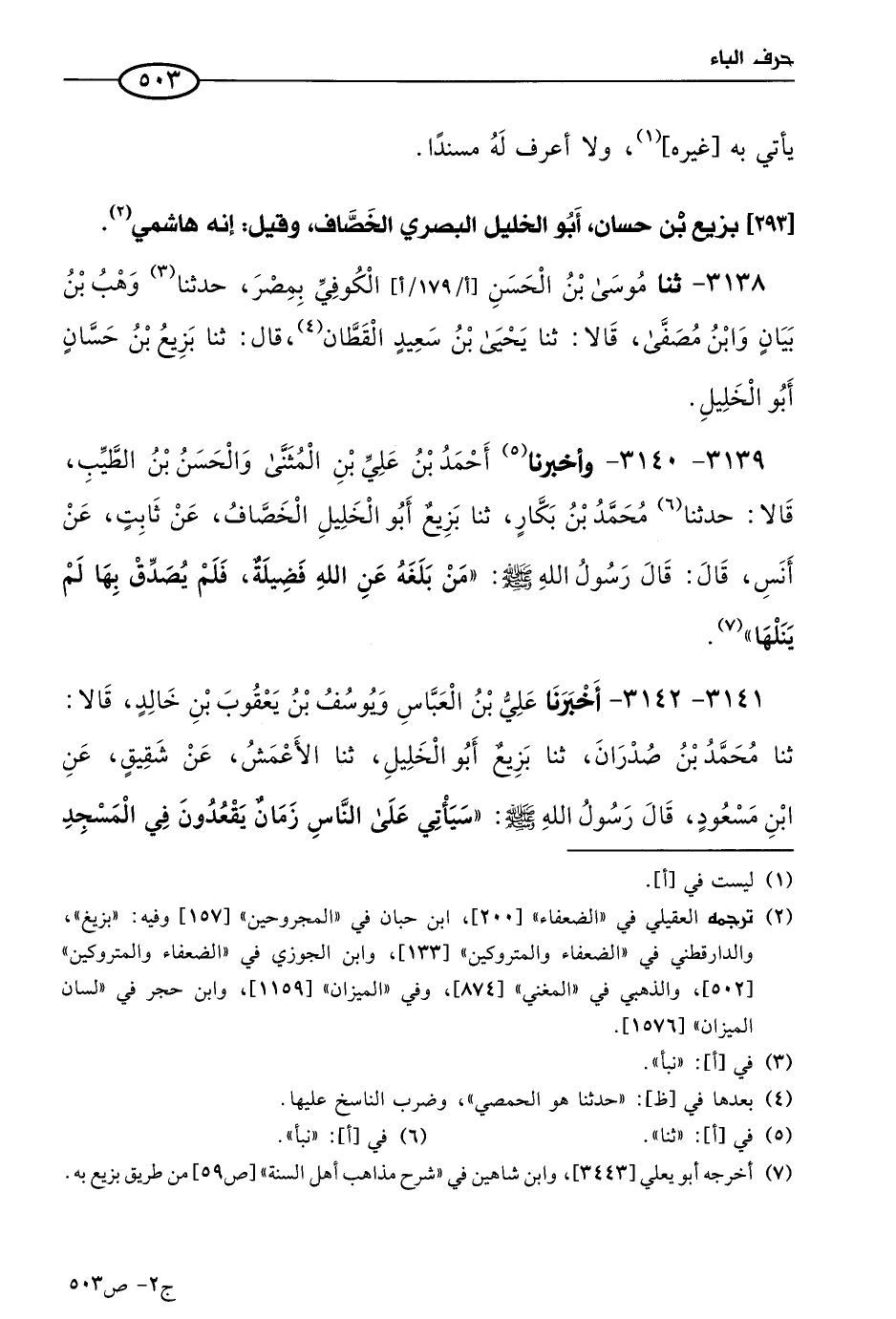 3138 - حَدثنا موسى بن الحسن الكوفي بمصر، حَدثنا وهب بن بيان، وابن مصفى، قالا: حَدثنا يَحيى بن سعيد القطان، قال: حَدثنا بزيع بن حسان أَبو الخليل (ح).
