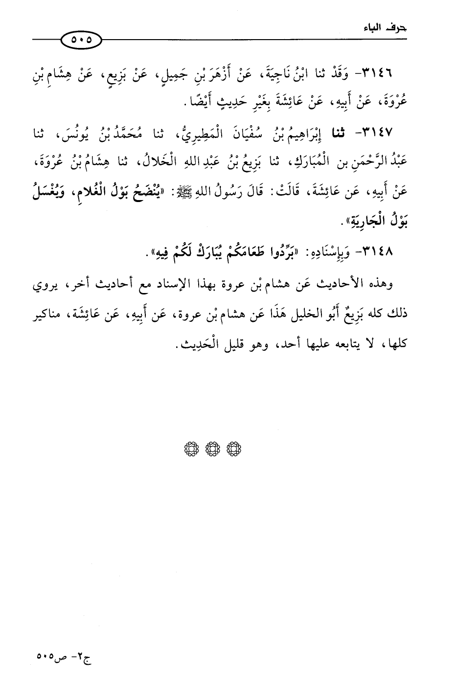 3147 - حَدثنا إبراهيم بن سفيان المطيري، حَدثنا مُحمد بن يُونُس، حَدثنا عَبد الرحمن بن المبارك، حَدثنا بزيع بن عَبد الله الخلال، حَدثنا هشام بن عروة، عن أبيه، عن عائشة قالت: قال رسول الله صَلى الله عَليه وسَلم: يُنْضَح بول الغلام ويُغْسَل بول الجارية.