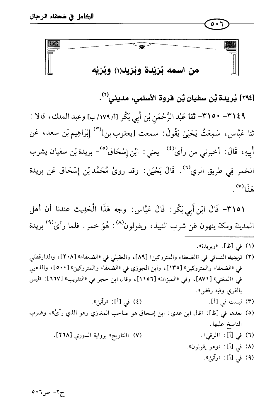 3149 - 3150 - حَدثنا عَبد الرحمن بن أبي بكر، وعَبد الملك، قالا: حَدثنا عباس، سمعت يَحيى يقول: سمعت يعقوب بن إبراهيم بن سعد، عن أبيه، قال: أخبرني من رأى، يَعني ابن إسحاق، بريدة بن سفيان يشرب الخمر في طريق الري. قال يَحيى: وقد روى مُحمد بن إسحاق عن بريدة هذا.