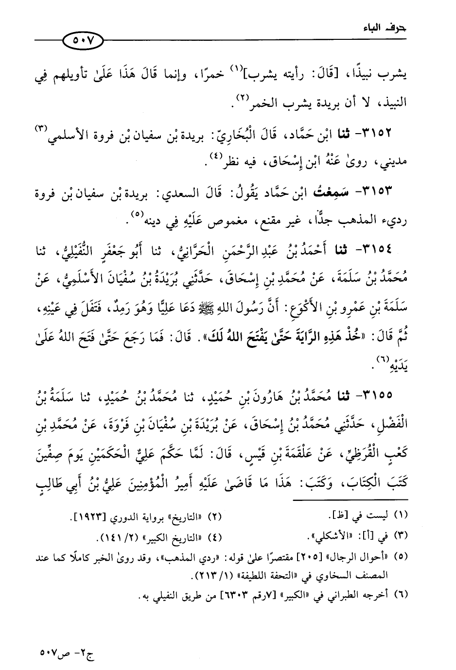 3155 - حَدثنا مُحمد بن هارون بن حميد، حَدثنا مُحمد بن حميد، حَدثنا سلمة بن الفضل، حَدَّثني مُحمد بن إسحاق، عن بريدة بن سفيان بن فروة، عن مُحمد بن كعب القرظي، عن علقمة بن قيس قال: لما حكَّم عليٌ الحكمين يوم صفين كتب الكتاب، وكتب: هذا ما قاضى عليه أمير المؤمنين علي بن أبي طالب معاوية بن أبي سفيان، فقال معاوية: لو شهدت أنك أمير المؤمنين ما قاتلتك.