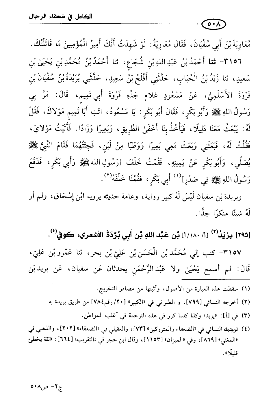 3156 - حَدثنا أحمد بن عَبد الله بن شجاع، حَدثنا أحمد بن مُحمد بن يَحيى بن سعيد، حَدثنا زيد بن الحباب، حَدَّثني أفلح بن سعيد، حَدَّثني بريدة بن سفيان بن فروة الأسلمي، عن مسعود، غلام جده فروة أبي تميم، قال: مر بي رسول الله صَلى الله عَليه وسَلم وأبو بكر، فقال أَبو بكر: يا مسعود ائت أبا تميم مولاك، فقل له يبعث معنا دليلا، فيأخذ بنا أخفى الطريق، وبعيرا وزادا، فأتيت مولاي فقلت له فبعثني وبعث معي بعيرا ووطبا من لبن، فجئتهما، فقام النبي الله صَلى الله عَليه وسَلم يصلي وأبو بكر عن يمينه، فقمت خلف رسول الله صَلى الله عَليه وسَلم وأبي بكر، فدفع رسول الله صَلى الله عَليه وسَلم في صدر أبي بكر، فقمنا خلفه.