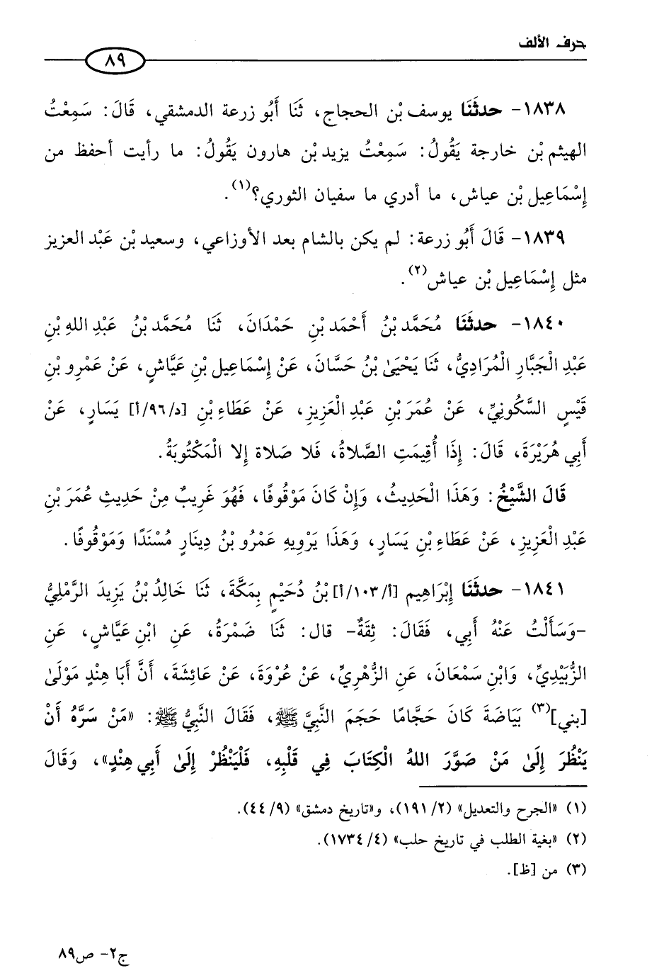 1839 - قال أبُو زُرْعَة: لم يكن بالشام بعد الأَوزاعي وسعيد بن عَبد العزيز مثل إسماعيل بن عياش.