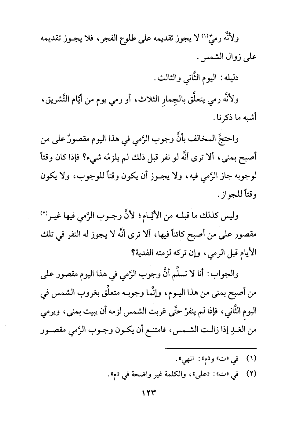 والجواب: أنا لا نسلم أن وجوب الرمي في هذا اليوم مقصور على من أصبح بمنى من هذا اليوم، وإنما وجوبه متعلق بغروب الشمس في اليوم الثاني، فإذا لم ينفر حتى غربت الشمس لزمه أن يبيت بمنى، ويرمي من الغد إذا زالت الشمس، فامتنع أن يكون وجوب الرمي مقصور