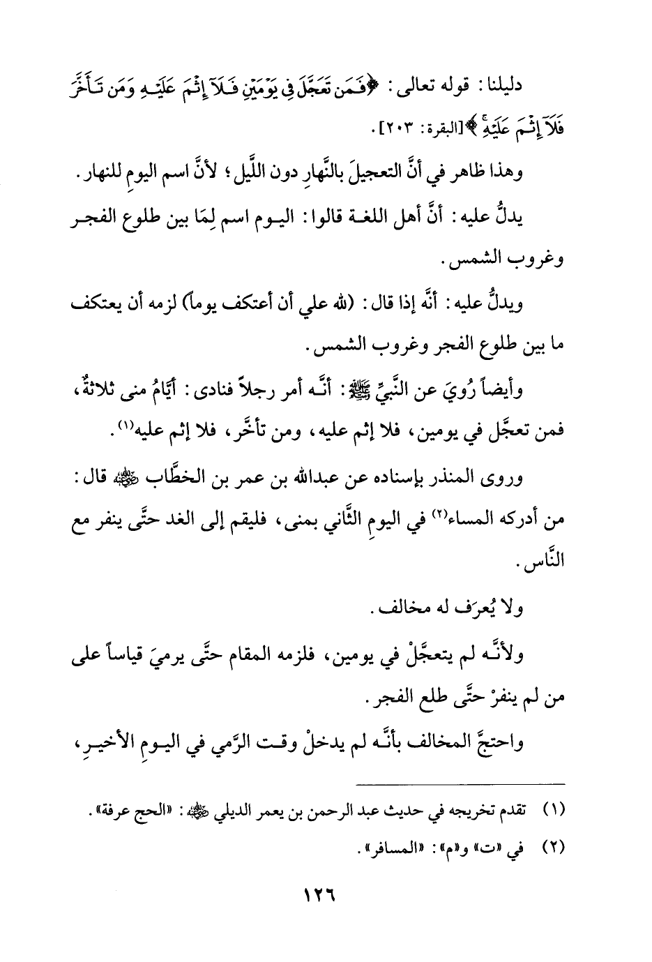 وأيضاً روي عن النبي صلى الله عليه وسلّم: أنه أمر رجلاً فنادى: أيام منى ثلاثة، فمن تعجل في يومين، فلا إثم عليه، ومن تأخر، فلا إثم عليه.
