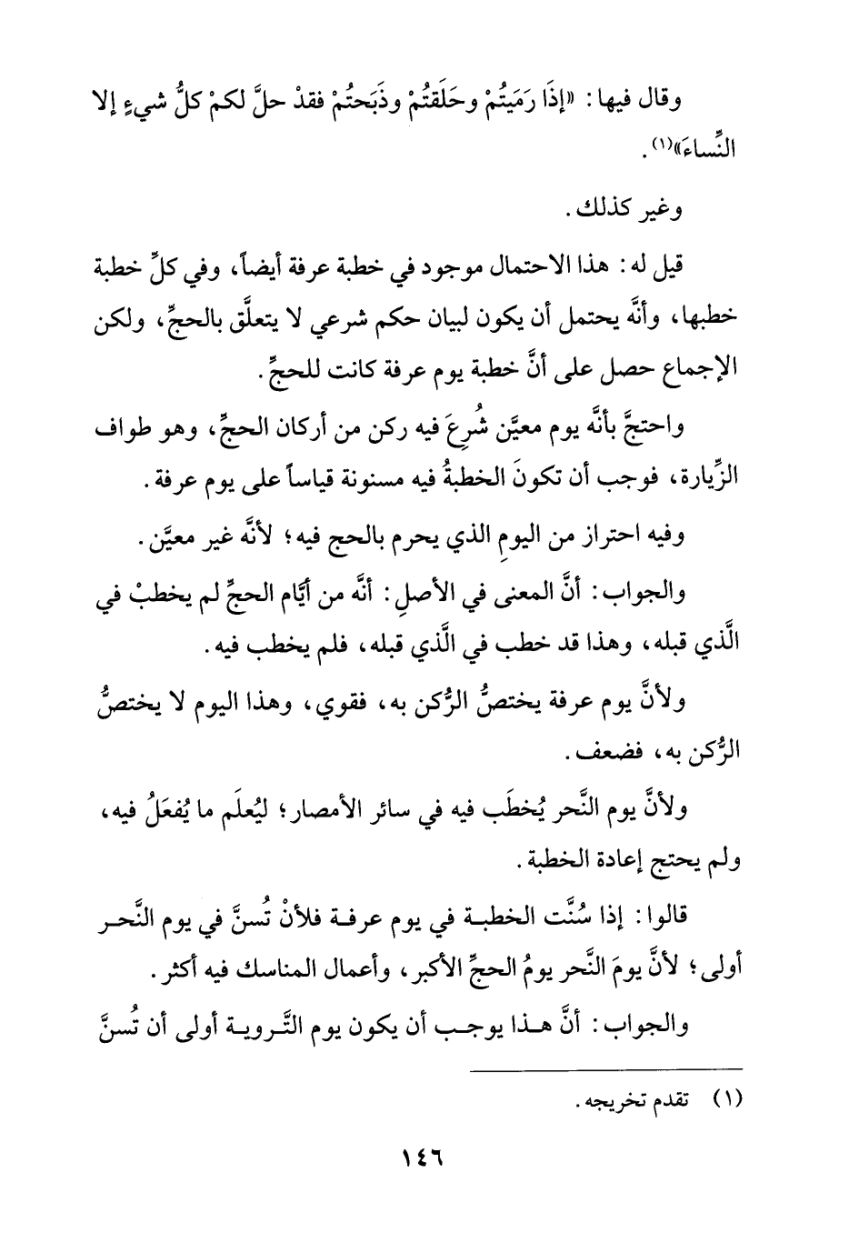 واحتج بأنه يوم معين شُرع فيه ركن من أركان الحج، وهو طواف الزيارة، فوجب أن تكون الخطبة فيه مسنونة قياساً على يوم عرفة.