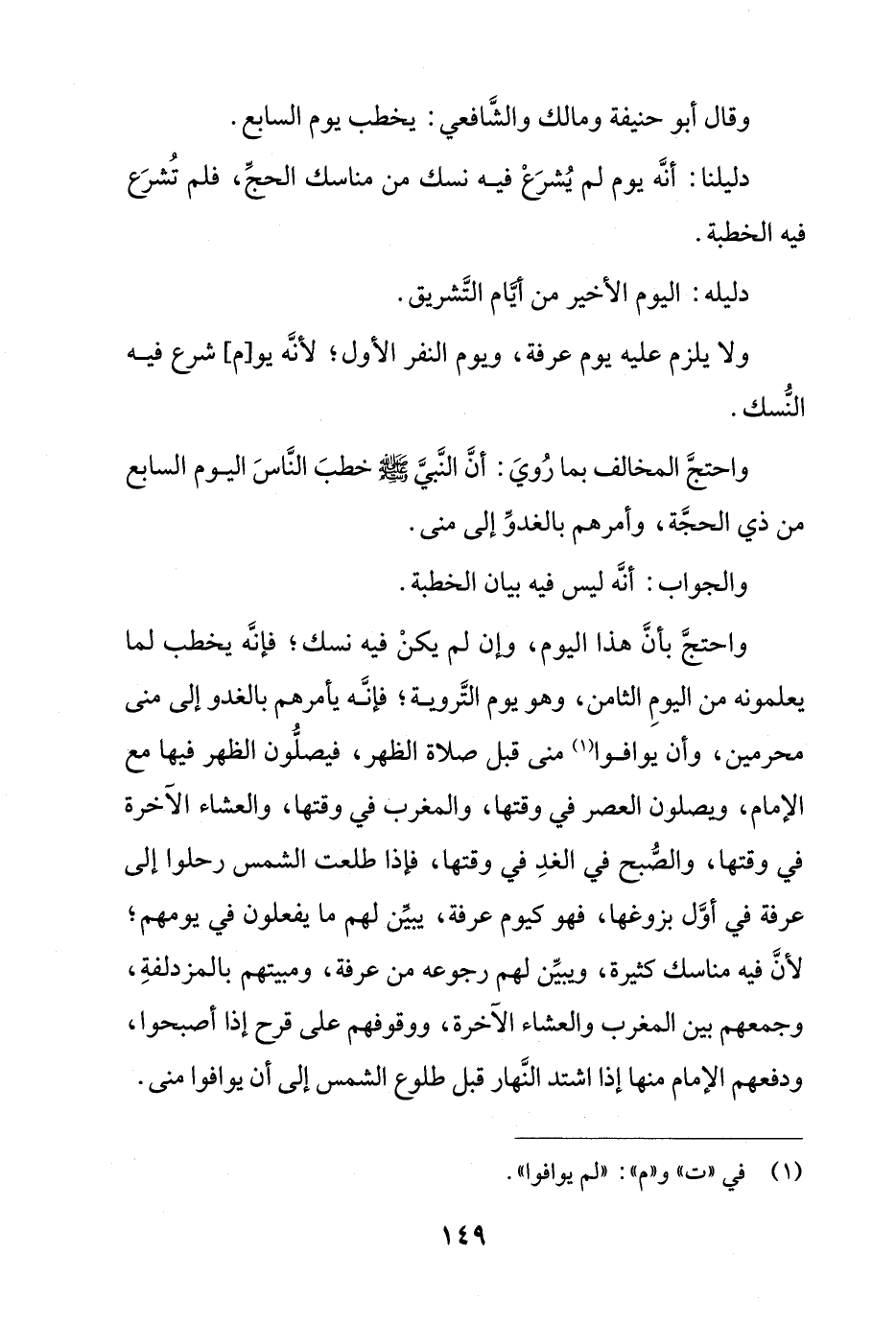 واحتج بأن هذا اليوم، وإن لم يكن فيه نسك؛ فإنه يخطب لما يعلمونه من اليوم الثامن، وهو يوم التروية؛ فإنه يأمرهم بالغدو إلى منى محرمين، وأن يوفوا منى قبل صلاة الظهر، فيصلون الظهر فيها مع الإمام، ويصلون العصر في وقتها، والمغرب في وقتها، والعشاء الآخرة في وقتها، والصبح في الغد في وقتها، فإذا طلعت الشمس رحلوا إلى عرفة في أول بزوغها، فهو كيوم عرفة، يبين لهم ما يفعلون في يومهم؛ لأن في مناسك كثيرة، ويبين لهم رجوعه من عرفة، ومبيتهم بالمزدلفة، وجمعهم بين المغرب والعشاء الآخرة، ووقوفهم على قرح إذا أصبحوا، ودفعهم الإمام منها إذا اشتد النهار قبل طلوع الشمس إلى أن يوافوا منى.