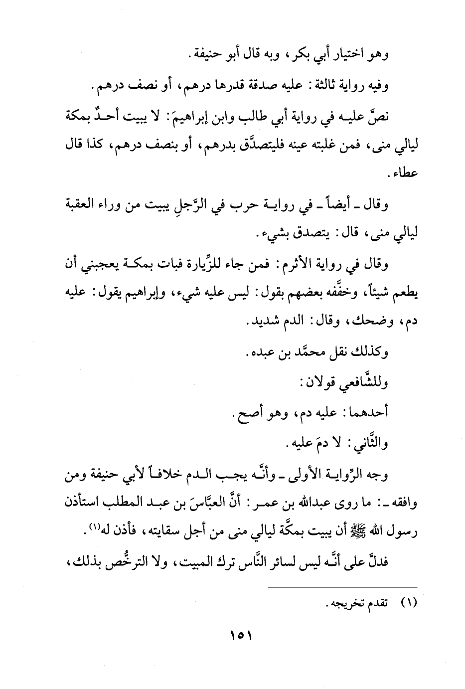 وجه الرواية الأولى -وأنه يجب الدم خلافاً لأبي حنيفة ومن وافقه-: ماروى عبد الله بن عمر: أن العباس بن عبد المطلب استأذن رسول الله صلى الله عليه وسلّم يبيت بمكة ليالي منى من أجل سقايته، فأذن له.