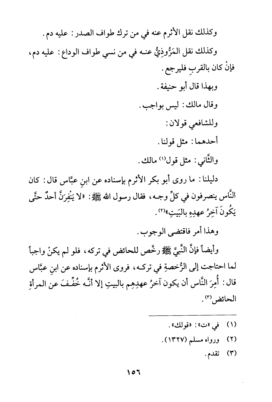وأيضاً فإن النبي صلى الله عليه وسلّم رخص للحائض في تركه، فلو لم يكن واجباً لما احتاجت إلى الرُّخصة في تركه، فروى الأثرم بإسناده عن ابن عباس قال: أُمر الناس أن يكون آخ عهدهم بالبيت إلا أنه خفف عن المرأة الحائض.
