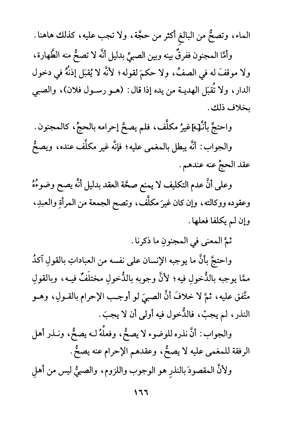 وأما المجنون ففرق بينه وبين الصبي بدليل أن لا تصح منه الطهارة، ولا موقف له في الصف، ولا حكم لقوله؛ لنه لا يُقبل إذنه في دخول الدار، ولا تُقبل الهدية من يده إذا قال: (هو رسول فلان)، والصبي بخلاف ذلك.