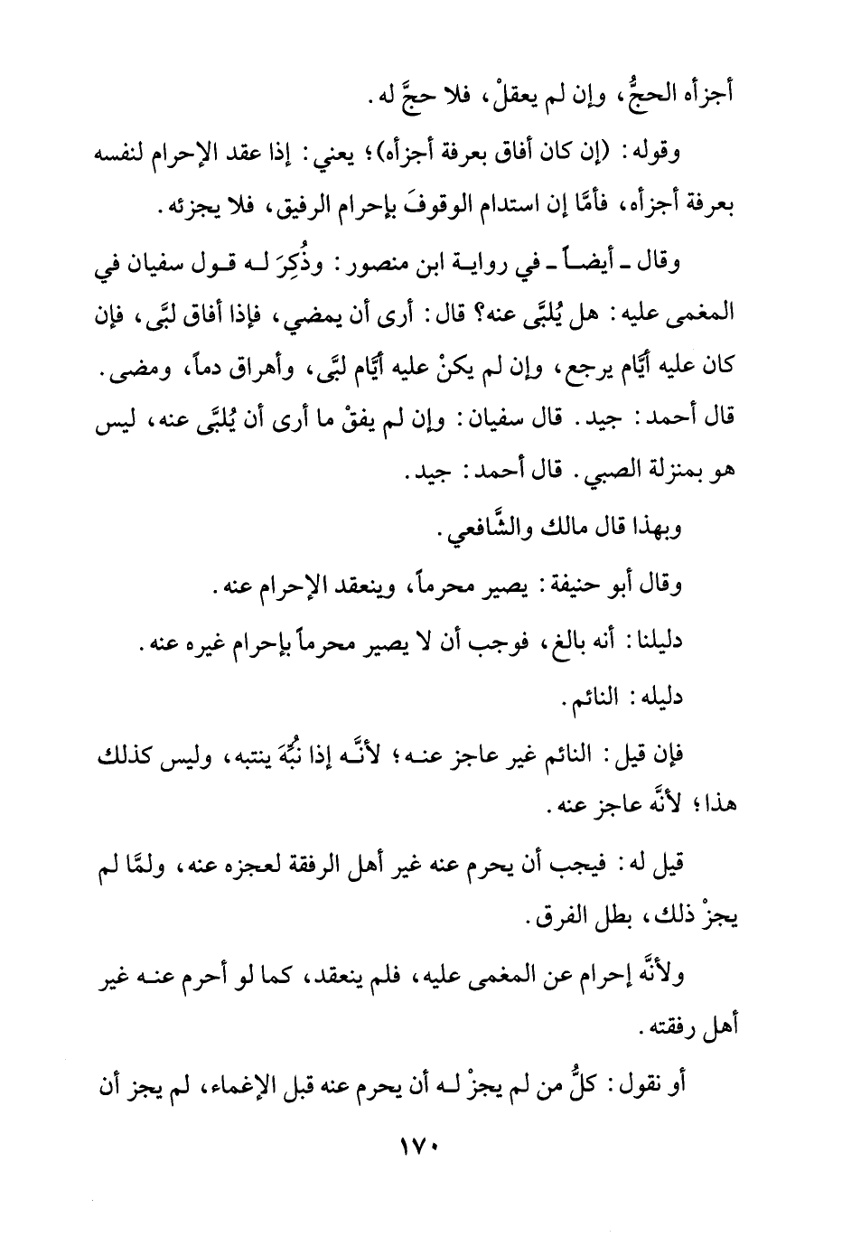 قال أحمد: جيد. قال سفيان: وإن لم يفق ما أرى أن يُلبي عنه، ليس هو بمنزلة الصبي. قال أحمد: جيد.