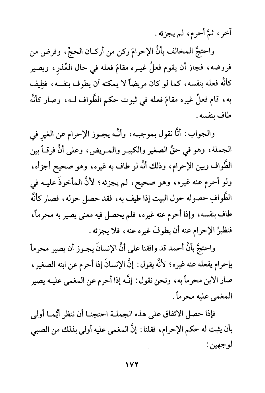 واحتج المخالف بأن الإحرام ركن من أركان الحج، وفرض من فروضه، فجاز أن يقوم فعل غيره مقام فعله في حال العُذر، ويصير كأنه فعله بنفسه، كما لو كان مريضاً لا يمكنه أن يطوف بنفسه، فطيف به، قام فعل غيره مقام فعله في ثبوت حكم الطواف له، وصار كأنه طاف بنفسه.