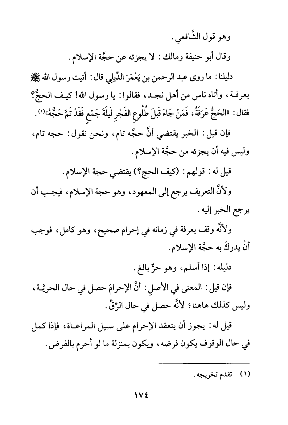ولأن التعريف يرجع إلى المعهود، وهو حجة الإسلام، فيجب أن يرجع الخبر إليه.