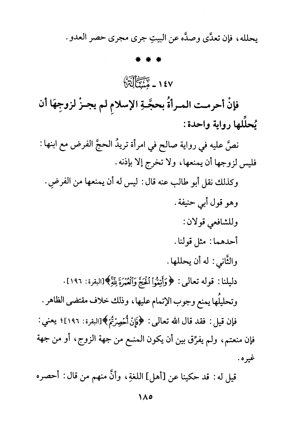 فإن قيل: فقد قال الله تعالى: {فَإِنْ أُحْصِرْتُمْ} [البقرة: 196]؛ يعني: فإن منعتم، ولم يفرق بين أن يكون المنع من جهة الزوج، أو من جهة غيره.