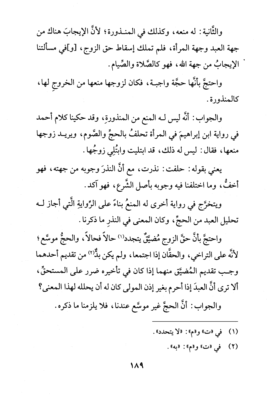 واحتج بأن حق الزوج مُضيق يتجدد حالاً فحالاً، والحج موسع؛ لأنه على التراخي، والحقان إذا اجتمعا، ولم يكن بد من تقديم أحدهما وجت تقديم المُضيق منهما إذا كان في تأخيره ضرر على المستحق، ألا ترى أن العبد إذا أحرم بغير إذن المولى كان له أن يحلله لهذا المعنى؟