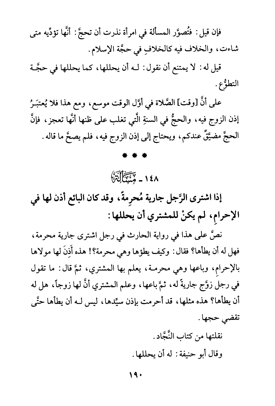 نص على هذا في رواية الحارث في رجل اشترى جارية محرمة، فهل له أن يطأها؟ فقال: وكيف يطؤها وهي محرمة؟! هذه أذن لها مولاها بالإحرام، وباعها وهي محرمة، يعلم بها المشتري، ثم قال: ما تقول في رجل زوج جارية له، ثم باعها، وعلم المشتري أن لها زوجاً، هل له أن يطأها؟ هذه مثلها، قد أحرمت بإذن سيدها، ليس له أن يطأها حتى تقضي حجها.