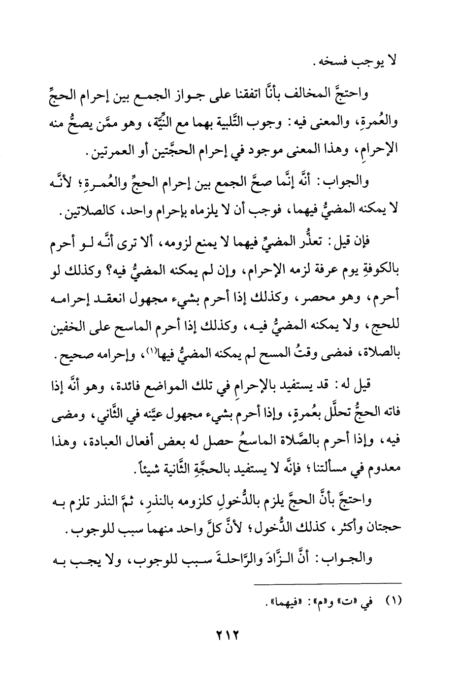 قيل له: قد يستفيد بالإحرام في تلك المواضع فائدة، وهو أنه إذا فاته الحج تحلل بعمرة، وإذا أحرم بشيء مجهول عينه في الثاني، ومضى فيه، وإذا أحرم بالصلاة الماسح حصل له بعض أفعال العبادة، وهذا معدوم في مسألتنا؛ فإنه لا يستفيد بالحجة الثانية شيئاً.