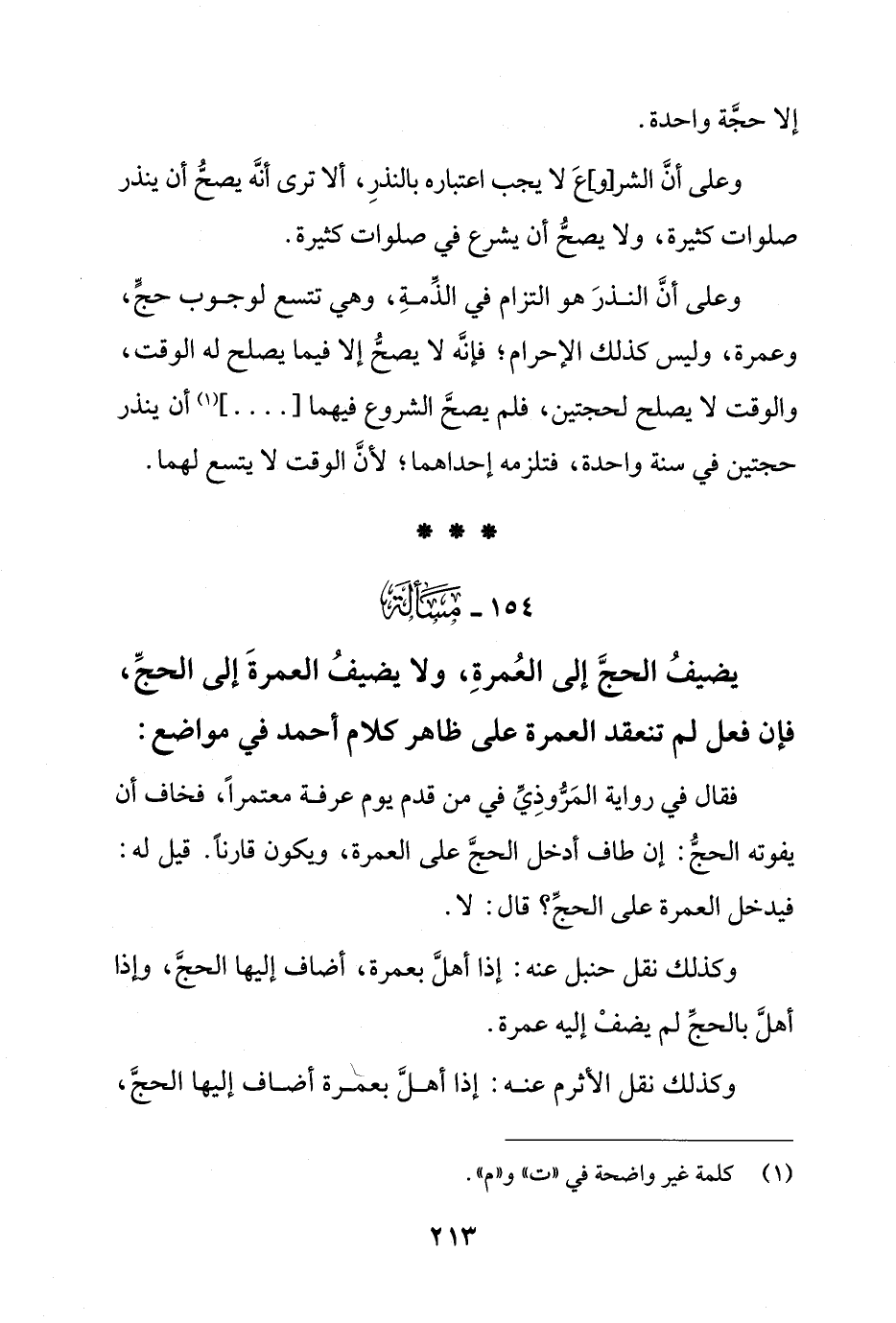وعلى أن النذر هو التزام في الذمة، وهي تتسع لوجوب حج، وعمرة، وليس كذلك الإحرام؛ فإنه لا يصح إلا فيما يصلح له الوقت، والوقت لا يصح لحجتين، فلم يصح الشروع فيهما [....] أن ينذر حجتين في سنة واحدة، فتلزمه إحداهما؛ لأن الوقت لا يتسع لهما.