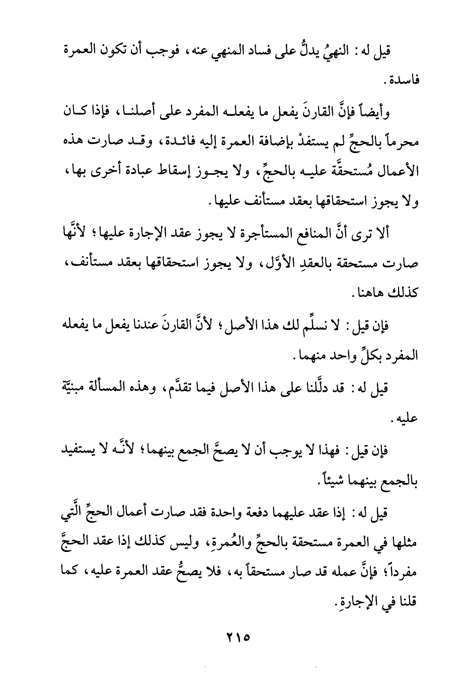 وأيضاً فإن القارن يفعل ما يفعله على أصلنا، فإذا كان محرماً بالحج لم يستفد بإضافة العمرة إليه فائدة، وقد صارت هذه الأعمال مُستحقة عليه بالحج، ولا يجوز إسقاط عبادة أخرى بها، ولا يجوز استحقاقها بعقد مستأنف عليها.
