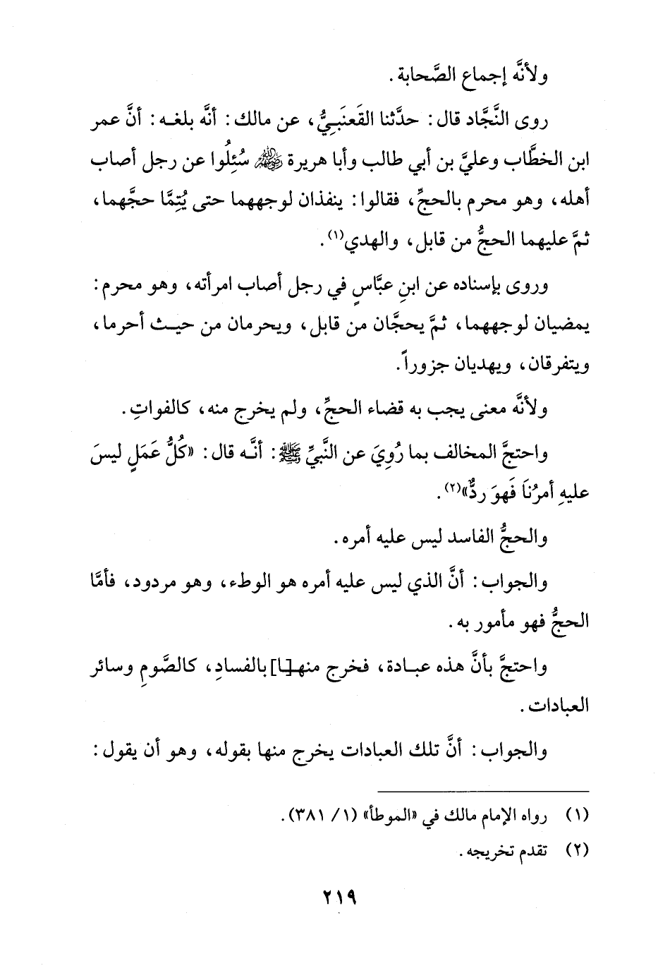روى النجاد قال: حدثنا القعنبي، عن مالك: أنه بلغه: أن عمر ابن الخطاب وعلي بن أبي طالب وأبا هريرة رضى الله عنه سُئِلُوا عن رجل أصاب أهله، وهو محرم بالحج، فقالوا: ينفذان لوجههما حتى يُتما حجهما، ثم عليهما الحج من قابل، والهدي.